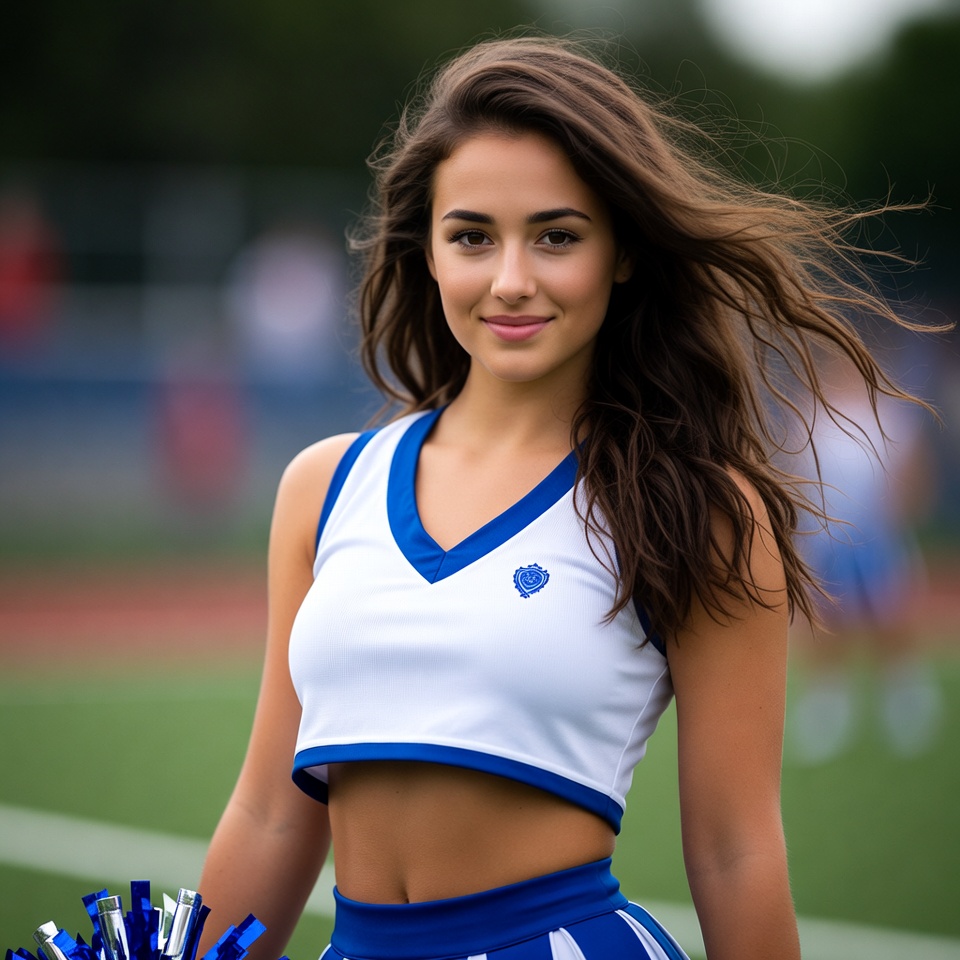 A cheerleader in a blue and white outfit smiles confidently during a sports event on a sunny day at the football field.
