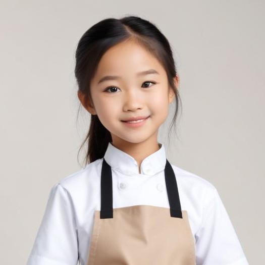 A young girl smiles confidently in a chef's coat and apron, showcasing her enthusiasm for cooking. Her expression reflects joy and determination.