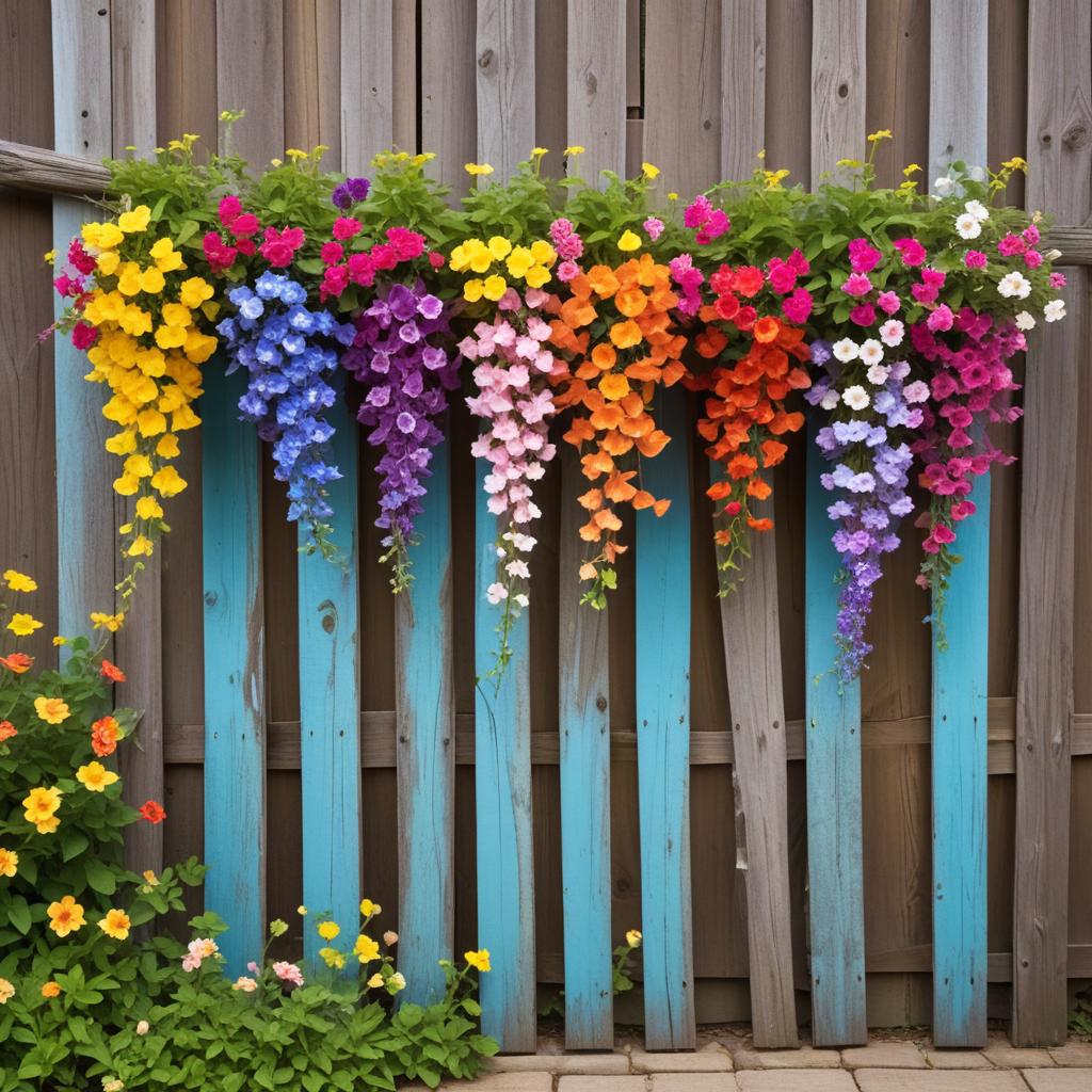 Vibrant flowers hang from a wooden fence creating a beautiful display. The mix of colors adds charm to the outdoor space.