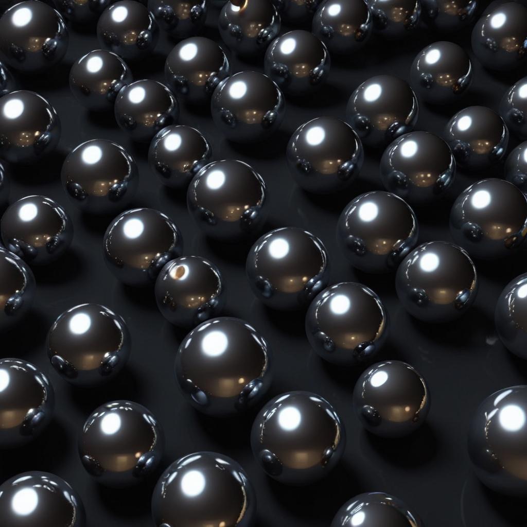 A collection of shiny metal spheres is arranged closely on a dark background, creating a visually striking pattern. The reflections enhance the scene.