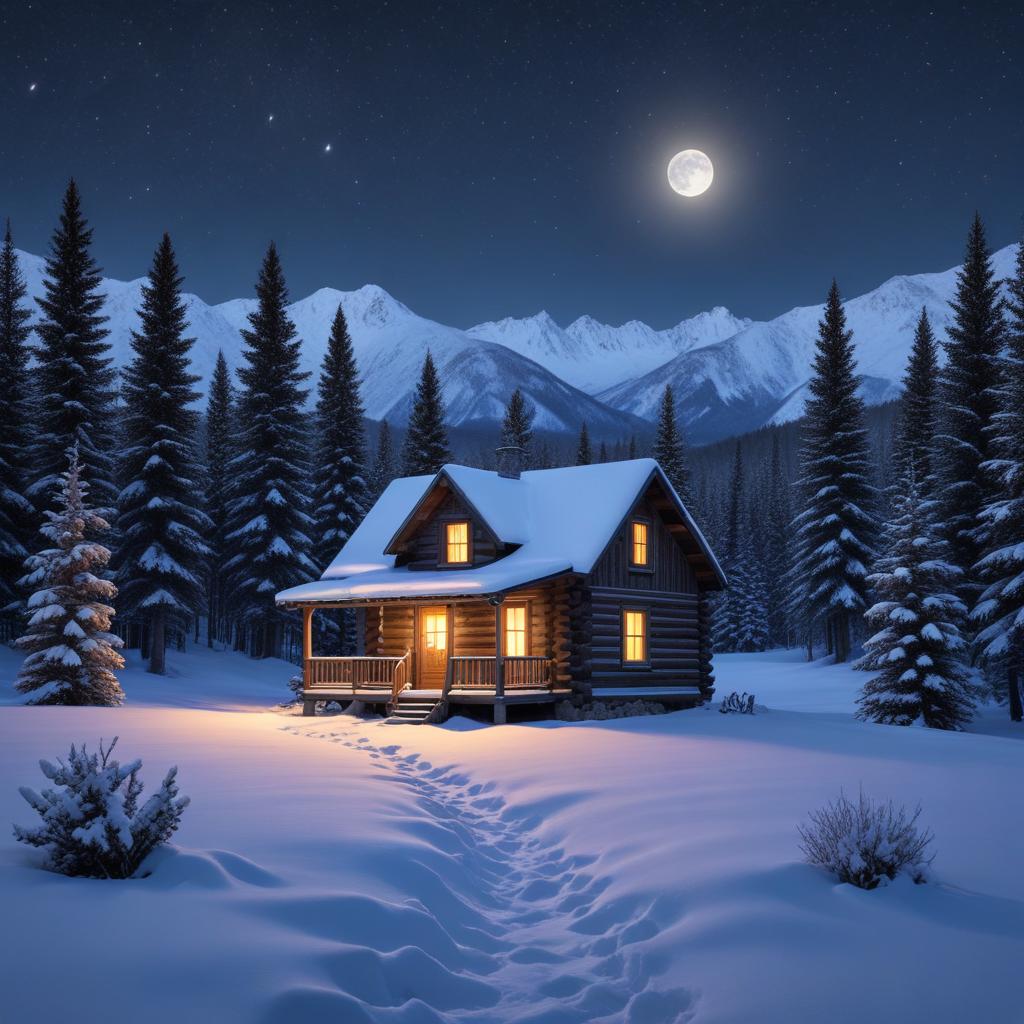 A warm cabin sits amid snow-covered trees under a bright moon. Soft light shines from the windows, creating a peaceful winter scene.