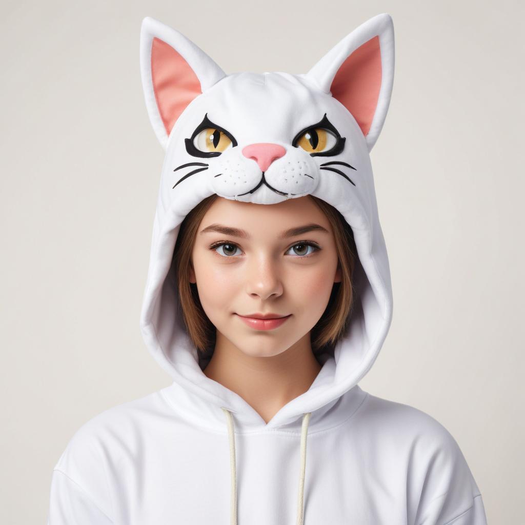 accessory, animal theme, casual, cat hat, cheerful, clothing, cozy, expression, fashion, fun, furry hat, hooded sweatshirt, playful, playful outfit, portrait, smile, studio, unique style, white, young woman