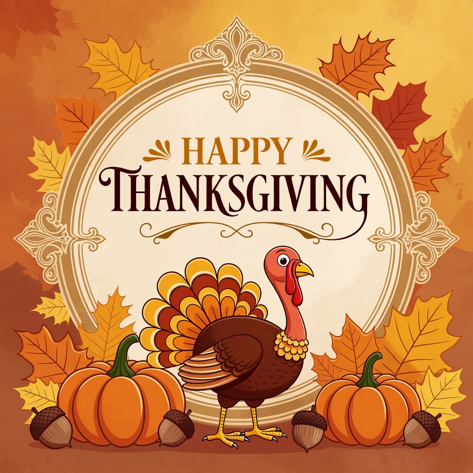 A festive design features a turkey surrounded by pumpkins and autumn leaves, celebrating the Thanksgiving holiday season in vibrant colors.