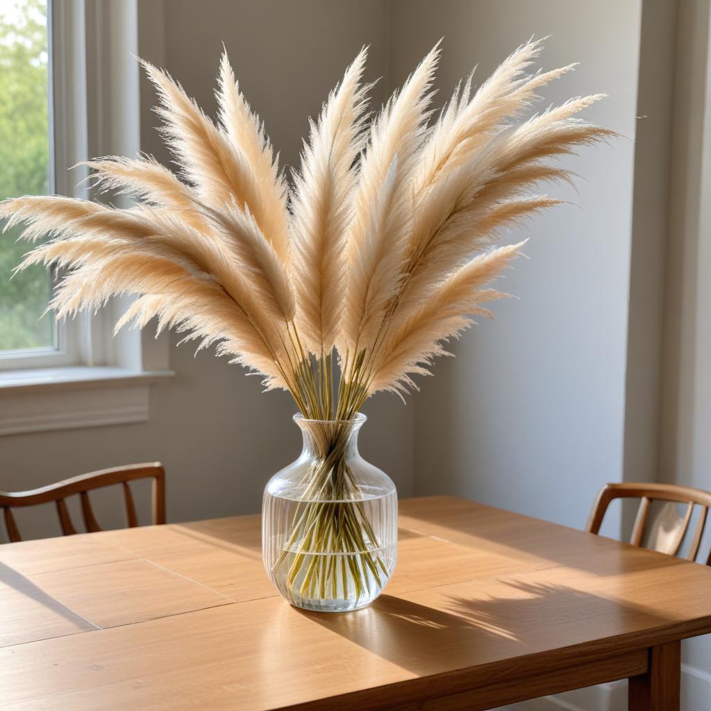 Pampas grass stands tall in a glass vase on a wooden table, reflecting sunlight in a cozy indoor space during late afternoon.