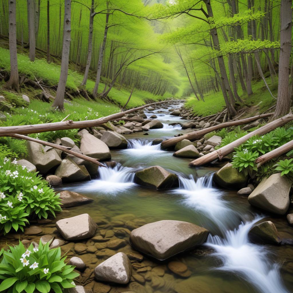 A serene stream flows through a lush green forest, surrounded by rocks and vibrant plants, capturing the essence of springtime tranquility.
