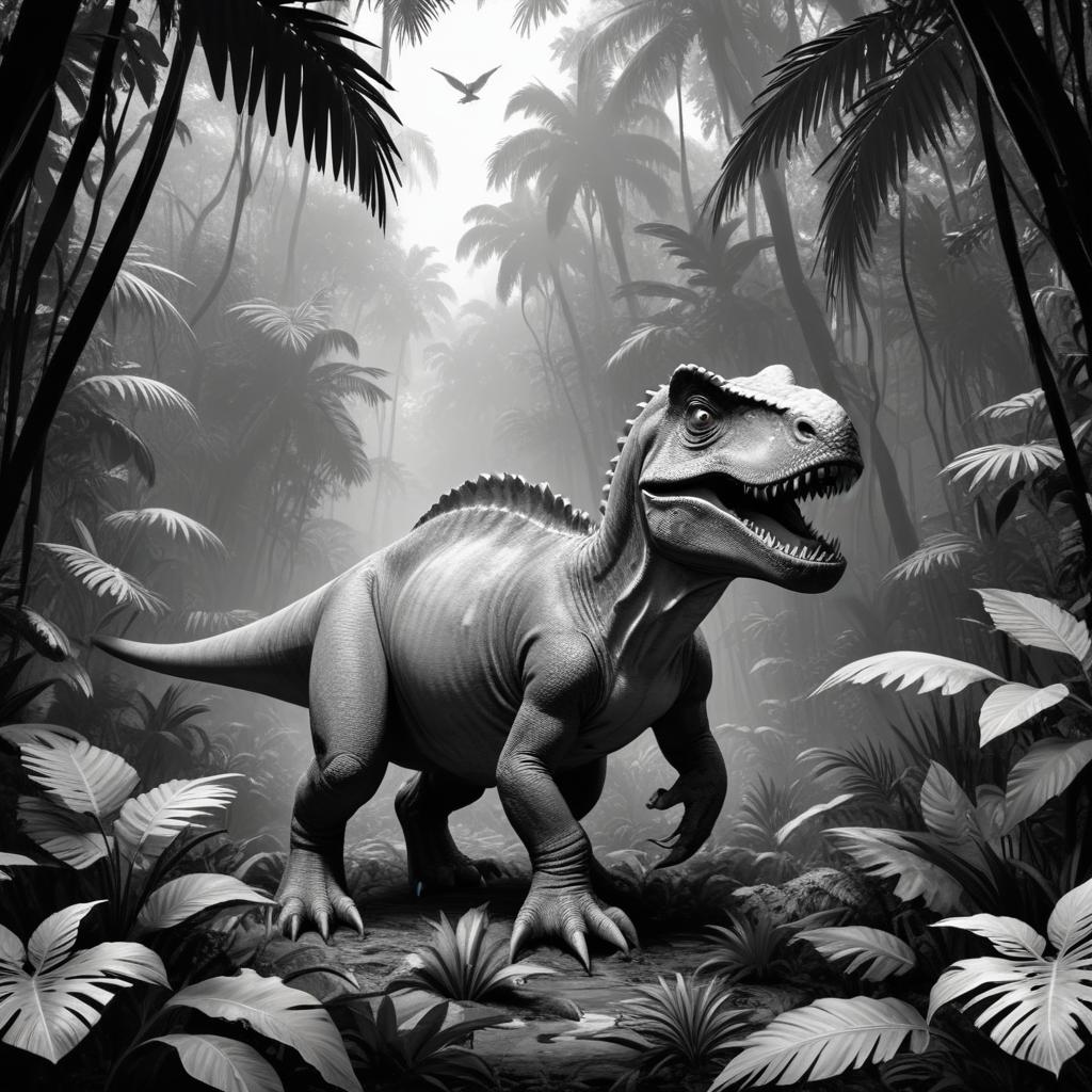 A large dinosaur stands in a dense jungle filled with lush greenery and tall palm trees. The atmosphere is misty and mysterious.