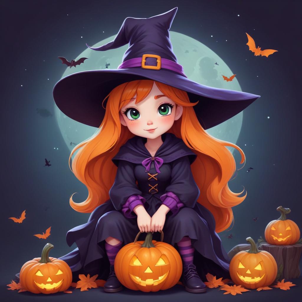 A young witch sits with carved pumpkins under a full moon, surrounded by bats and autumn leaves, celebrating Halloween festivities.