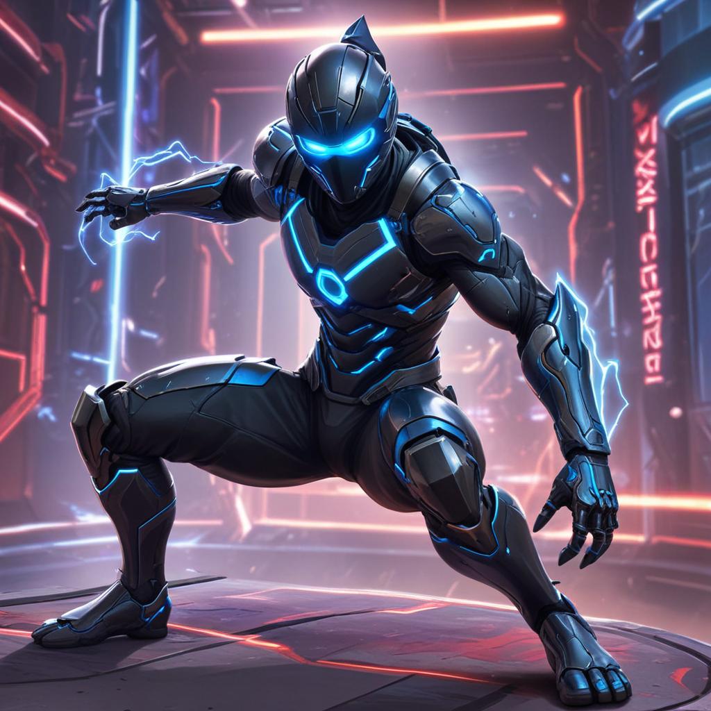 action, armored, battle stance, blue accents, character, cyberpunk, design, digital art, energy, futuristic, gaming, hero, high-tech, lighting, modern, movement, power, sci-fi, strength, technology