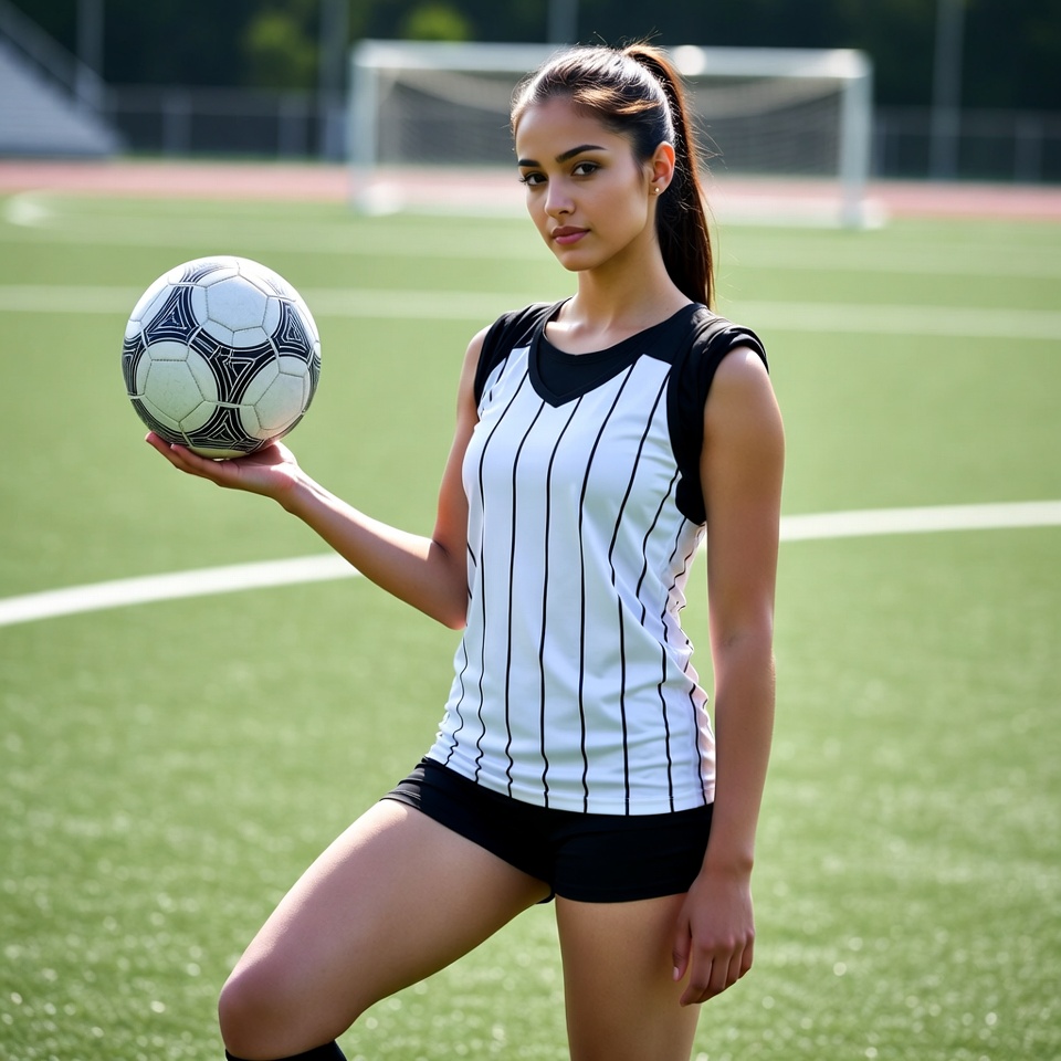 A young woman stands confidently on a soccer field, holding a soccer ball in one hand. She wears a sporty outfit and displays athletic determination.
