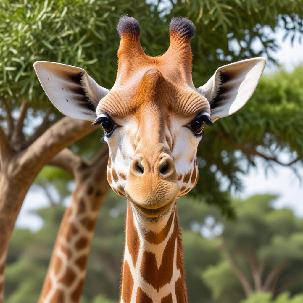 African savannah, animal, animal behavior, biodiversity, close-up, curious expression, fauna, giraffe, herbivore, lush trees, mammals, nature, outdoor, portrait, safari, sunny day, tall neck, unique patterns, wildlife, wildlife habitat