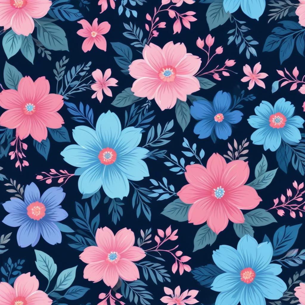 Colorful flowers in pink and blue bloom against a dark backdrop, creating a vibrant and lively pattern full of life.