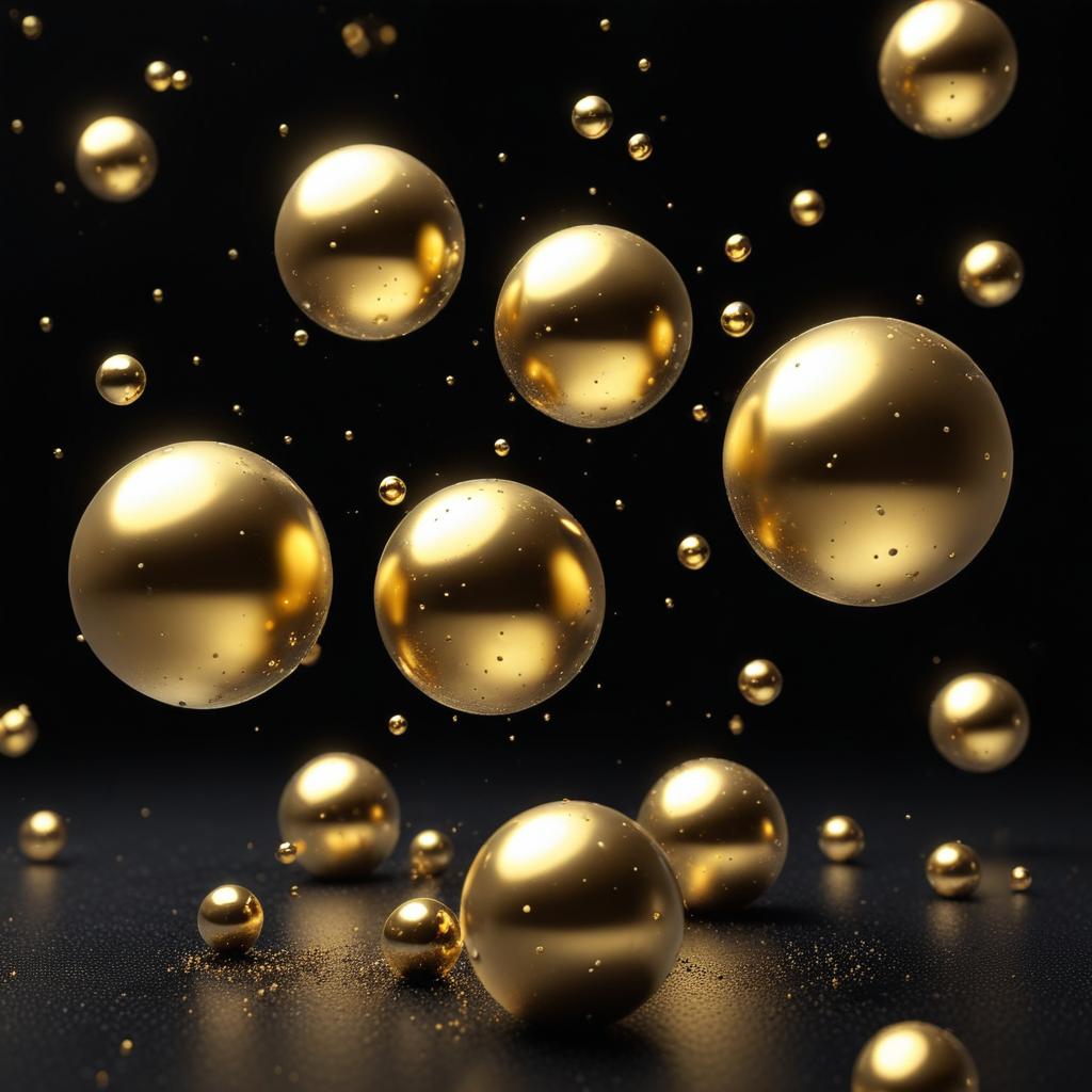 Shiny golden spheres float in the air, creating a dynamic and eye-catching display against a dark background, showcasing elegance and depth.