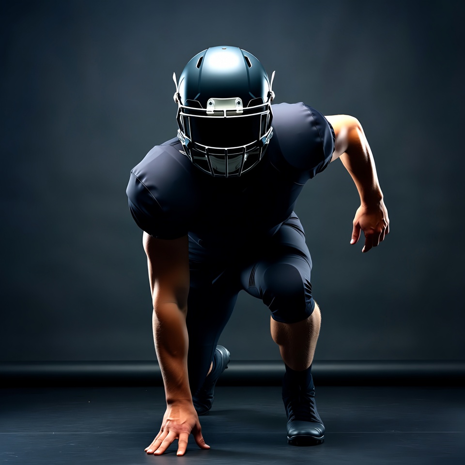 A football player in black gear crouches ready to sprint, showcasing strength and determination against a dark background.
