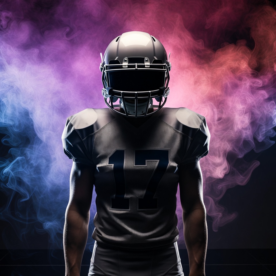 A football player stands confidently in a dark setting, surrounded by colorful smoke, preparing for an intense game moment.