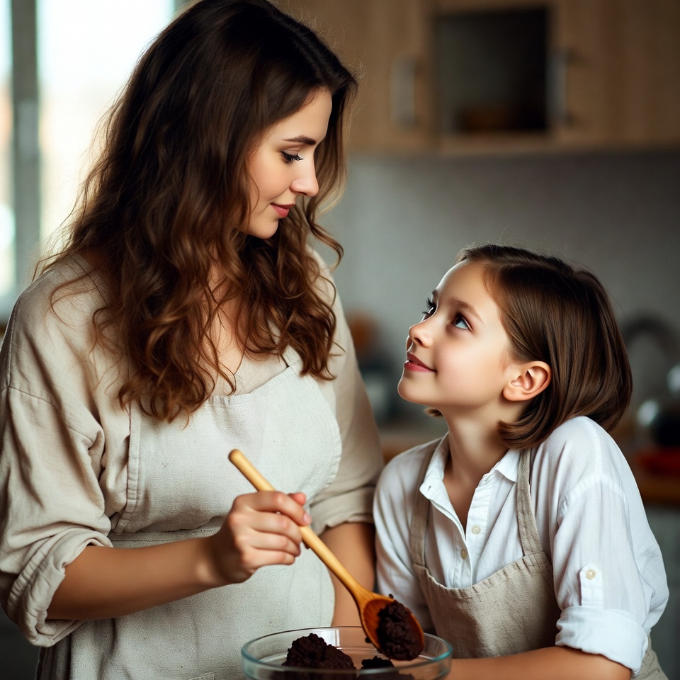 A woman and a girl share joyful moments while baking in a cozy kitchen. They mix dough and enjoy each other's company.