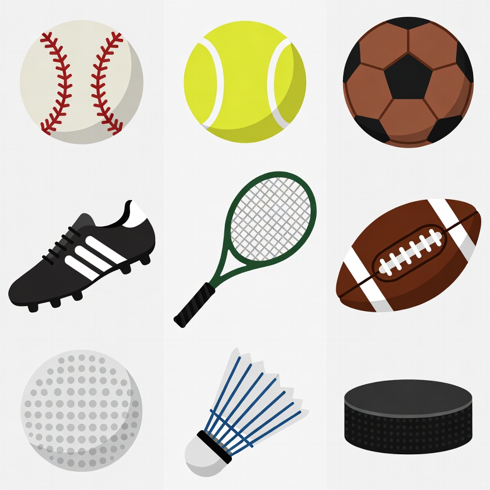 Different types of sports balls and equipment, including baseball, tennis, soccer, and football gear, arranged neatly.
