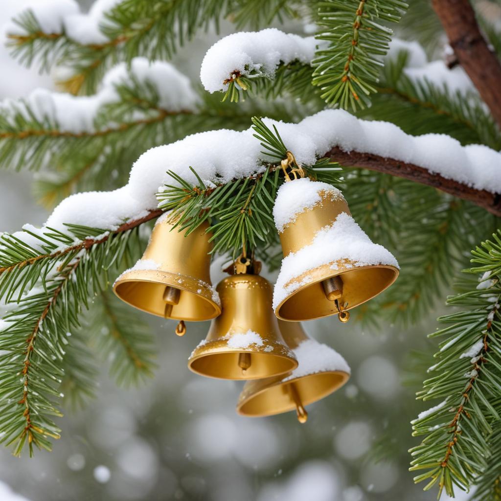 Golden bells hang among snowy pine branches, creating a festive winter atmosphere. The delicate snow adds charm to the scene.