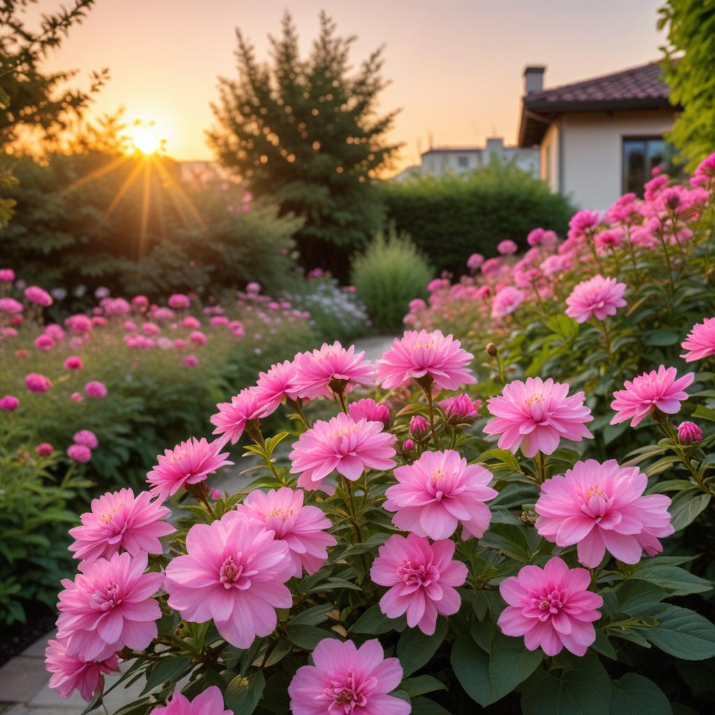 Bright pink flowers bloom in a garden at sunset, with trees and a house in the background, creating a peaceful evening scene.