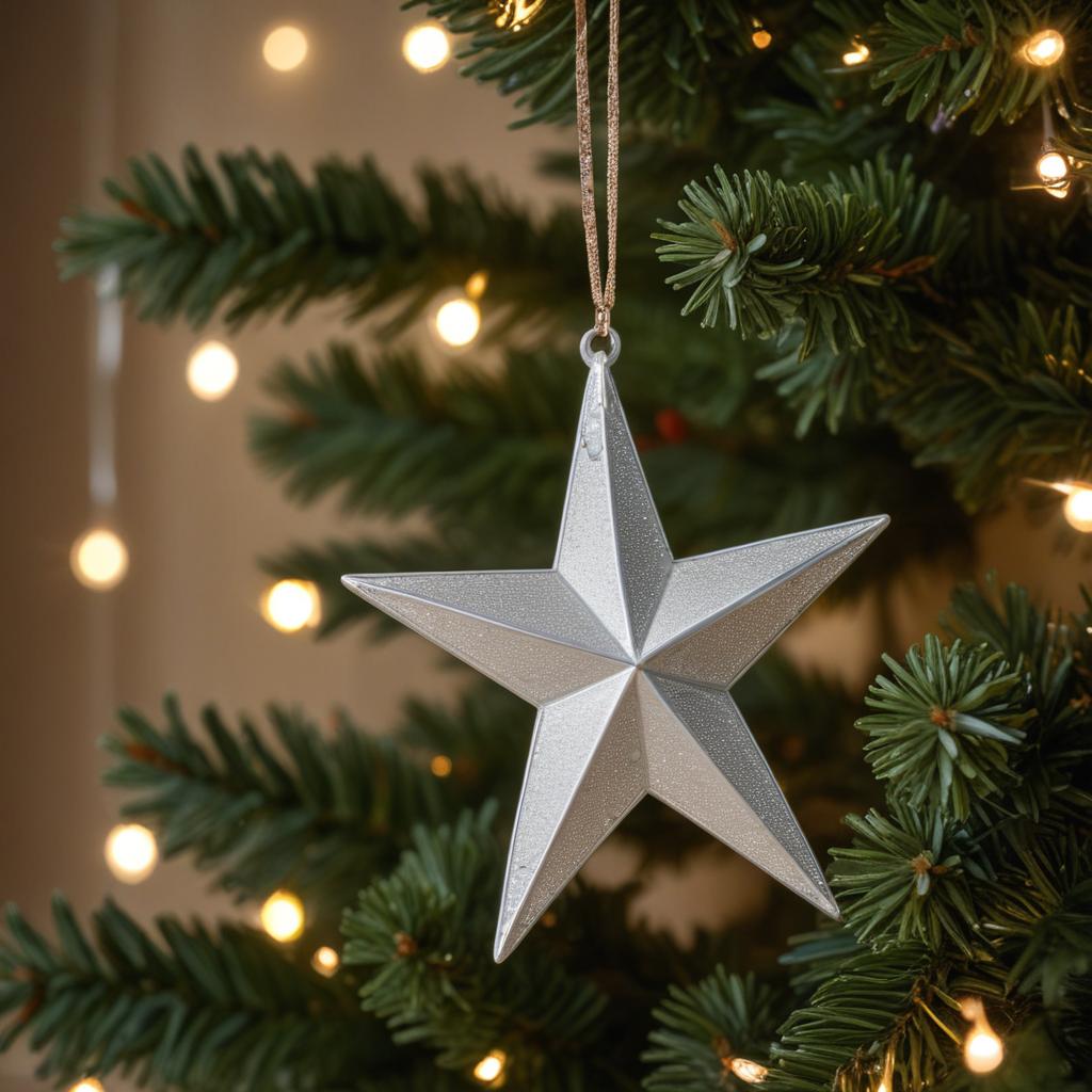 A silver star ornament hangs from a Christmas tree branch, illuminated by warm, twinkling lights, creating a festive atmosphere.