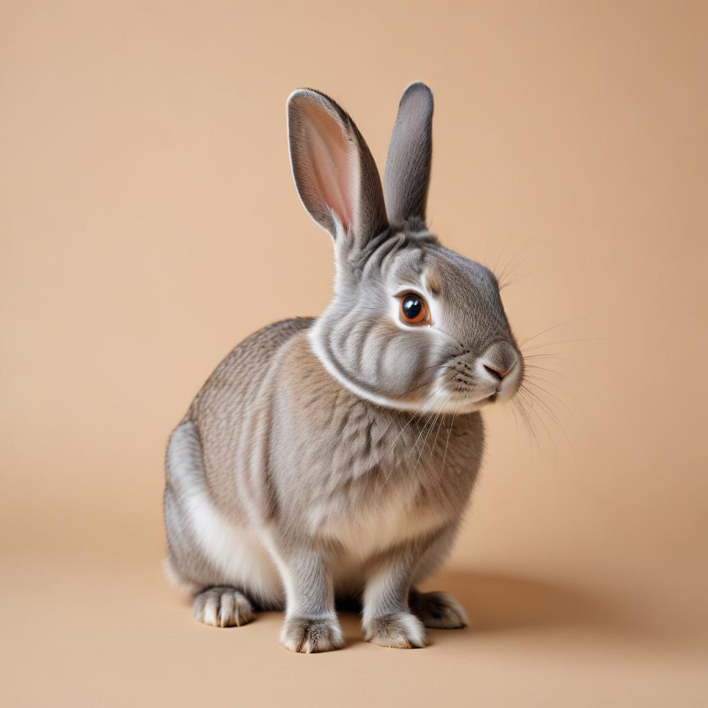 A fluffy gray rabbit sits on a soft, neutral background, displaying its curious expression and long ears. The scene is calm and serene.