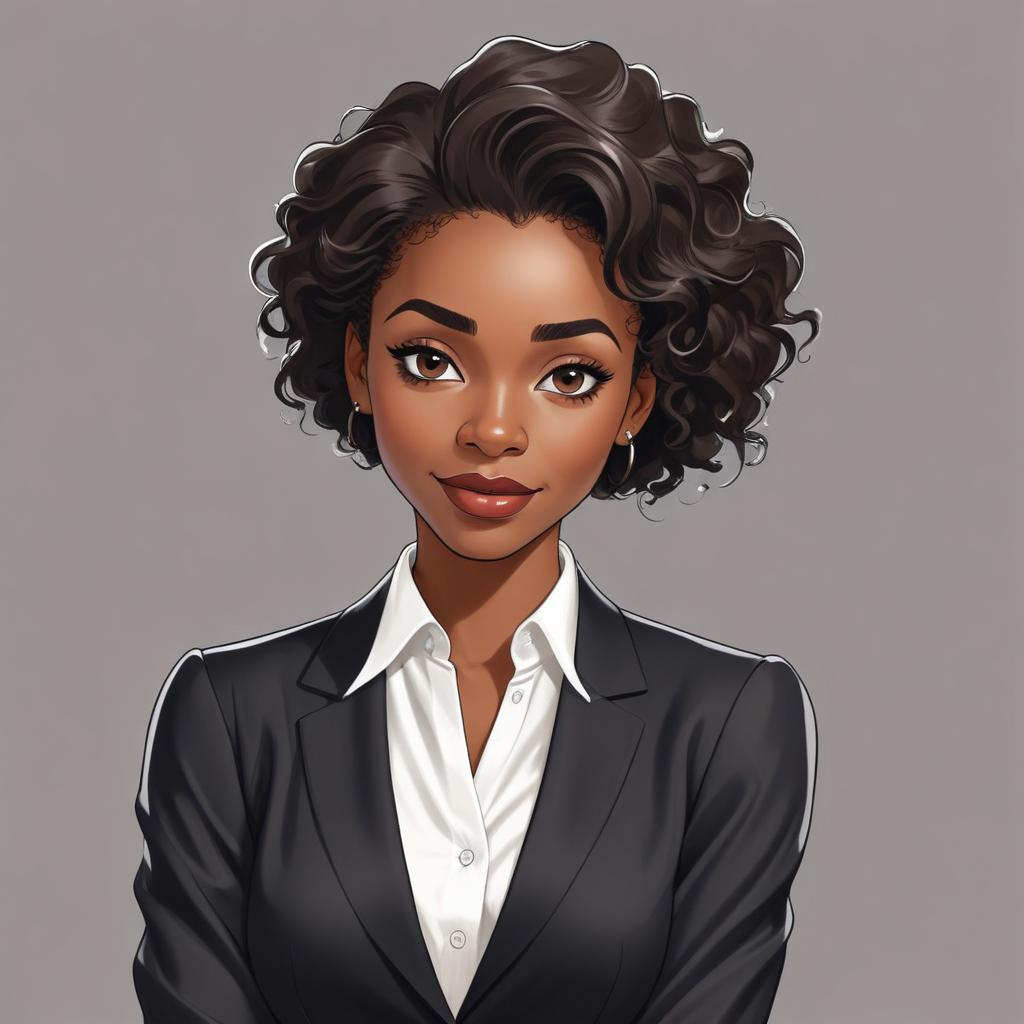 A young woman with curly hair wears a black suit and white shirt, exuding confidence and professionalism in a neutral background setting.