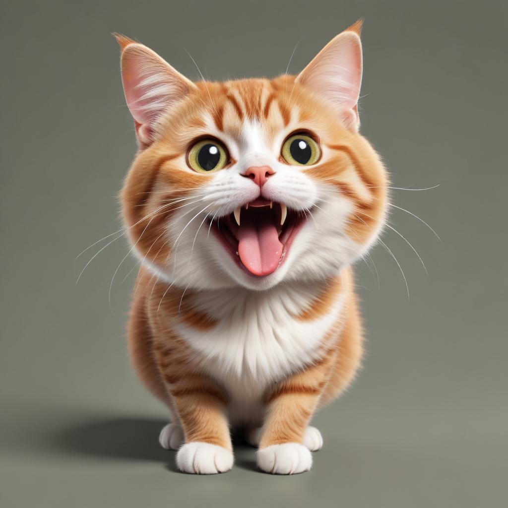 A cheerful orange cat with large round eyes and a wide smile is sitting on a plain background, exuding joy and curiosity.