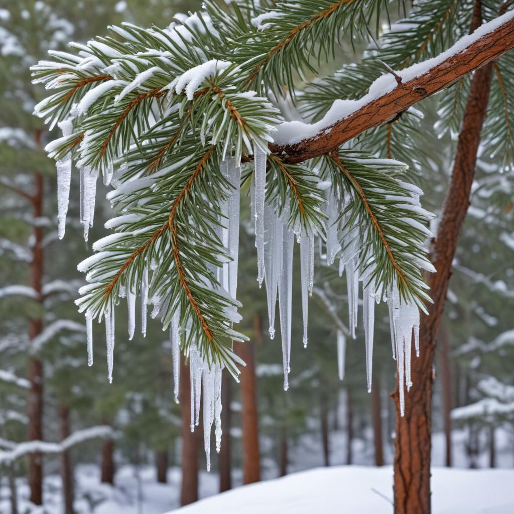 Long icicles hang from a snow-covered pine branch in a tranquil winter forest, showcasing the beauty of nature during the cold season.
