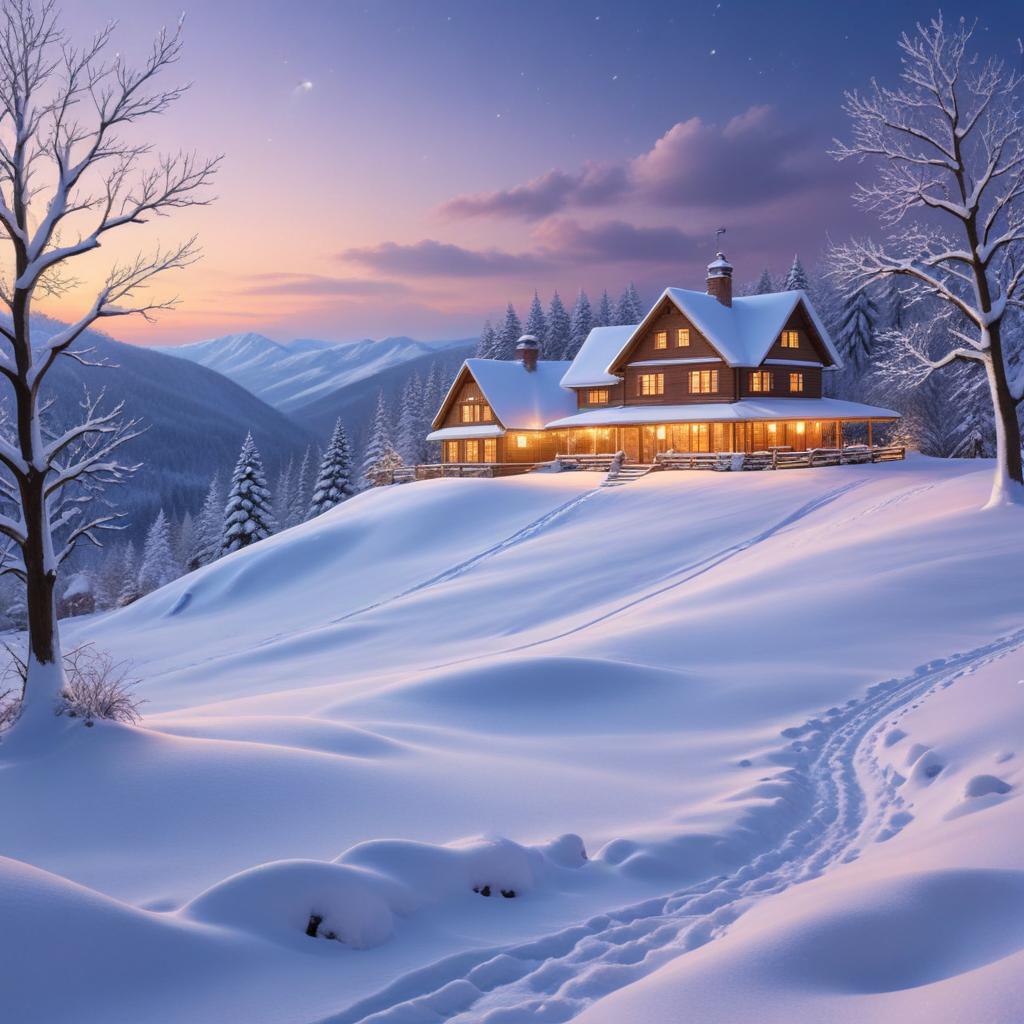 A charming cabin surrounded by snow-covered trees glows warmly against a soft winter sunset. Footprints in the snow lead toward the cabin.