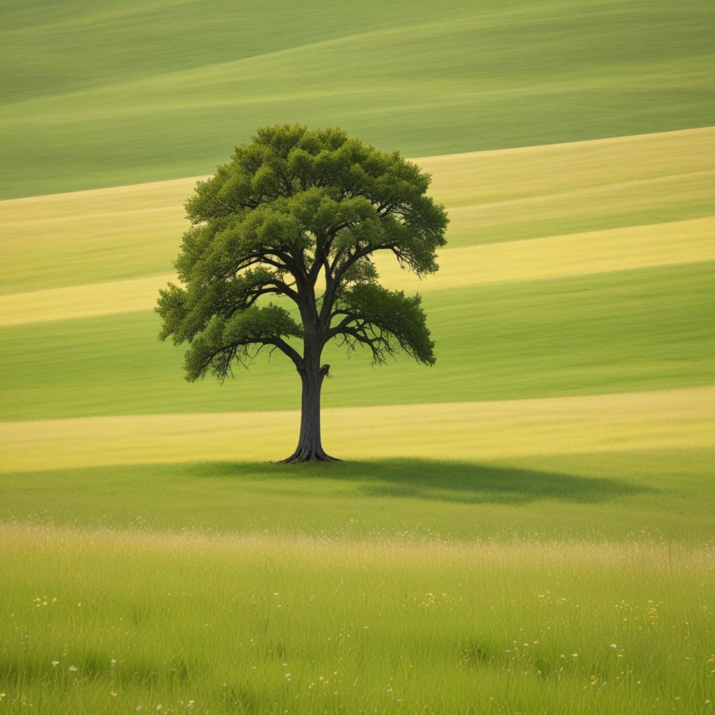 A solitary tree stands tall in a vibrant green field, surrounded by layers of lush grass and gently rolling hills under bright sunlight.