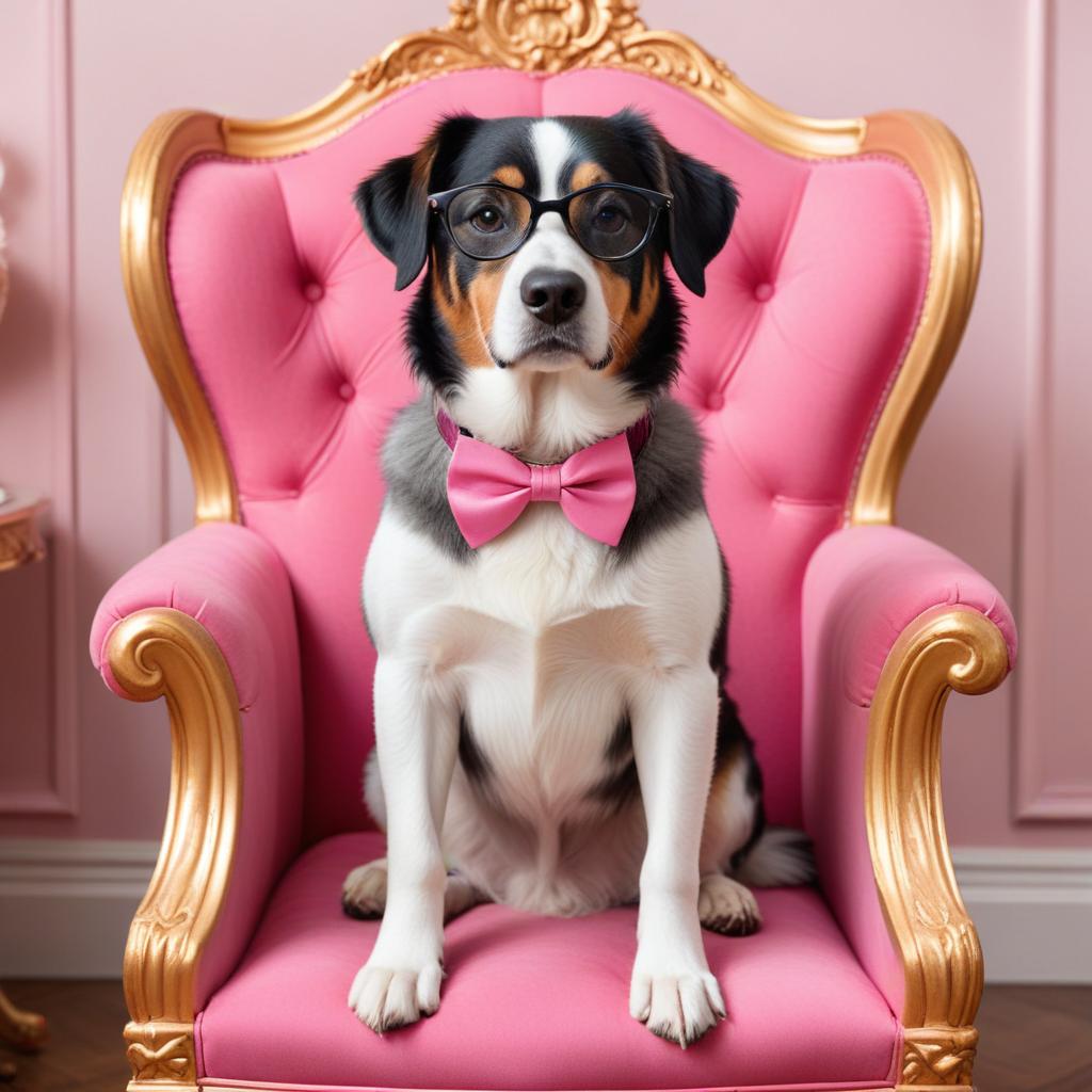 A dog wears glasses and a bow tie while sitting on a pink chair in a decorated room. The setting looks elegant and playful.