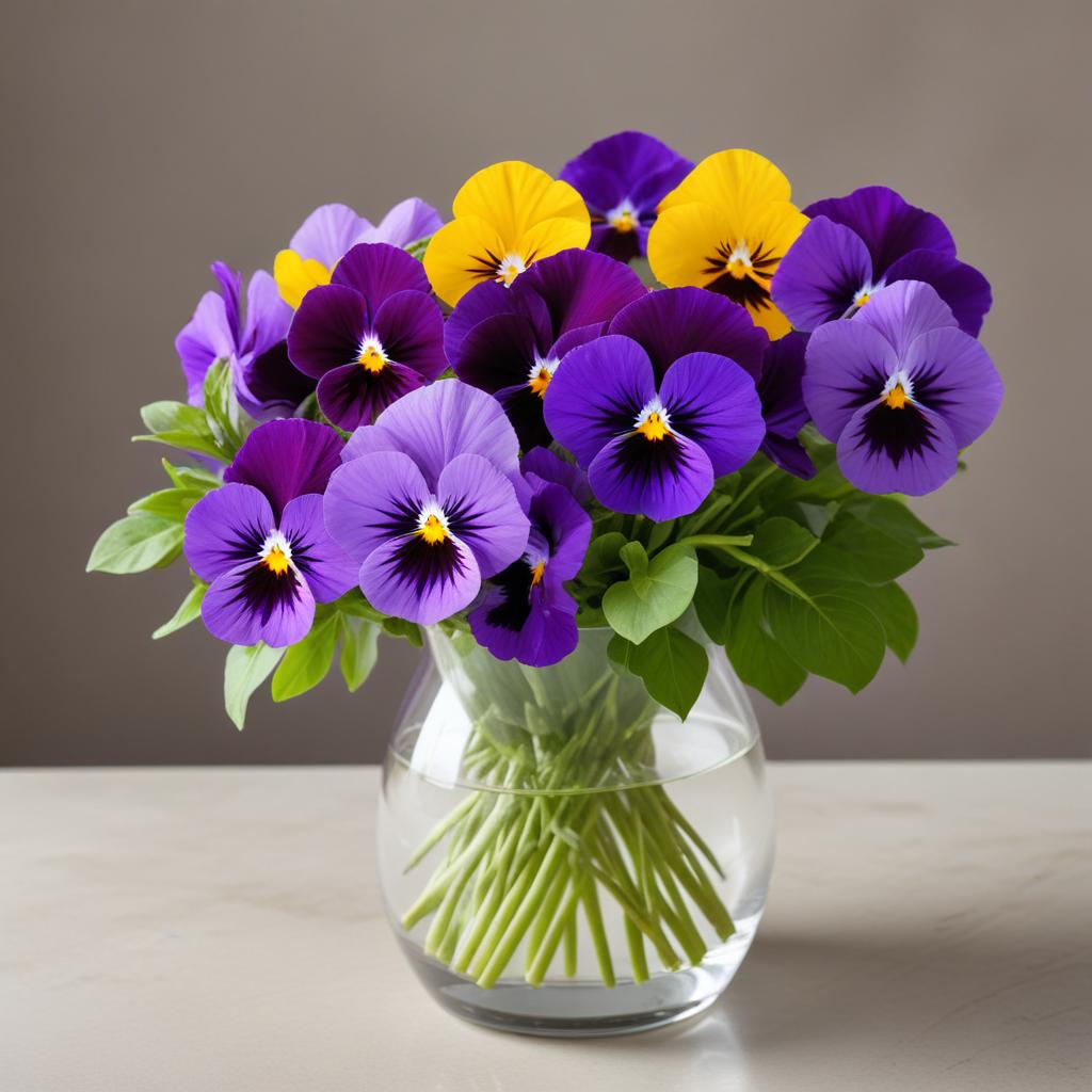 Colorful pansies in shades of purple and yellow are arranged beautifully in a clear vase, adding charm to any room setting.