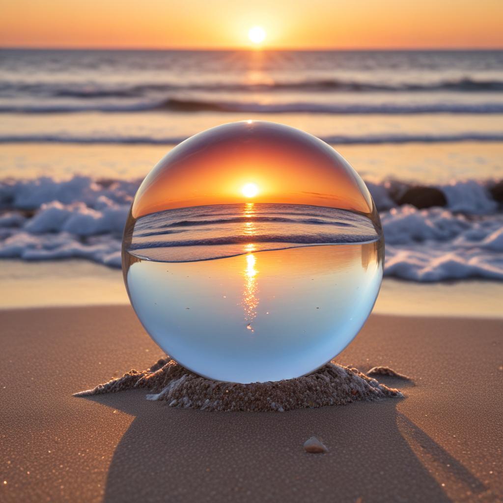 A glass sphere rests on the beach, reflecting a vibrant sunset over the ocean waves. The contrast of colors creates a stunning visual effect.