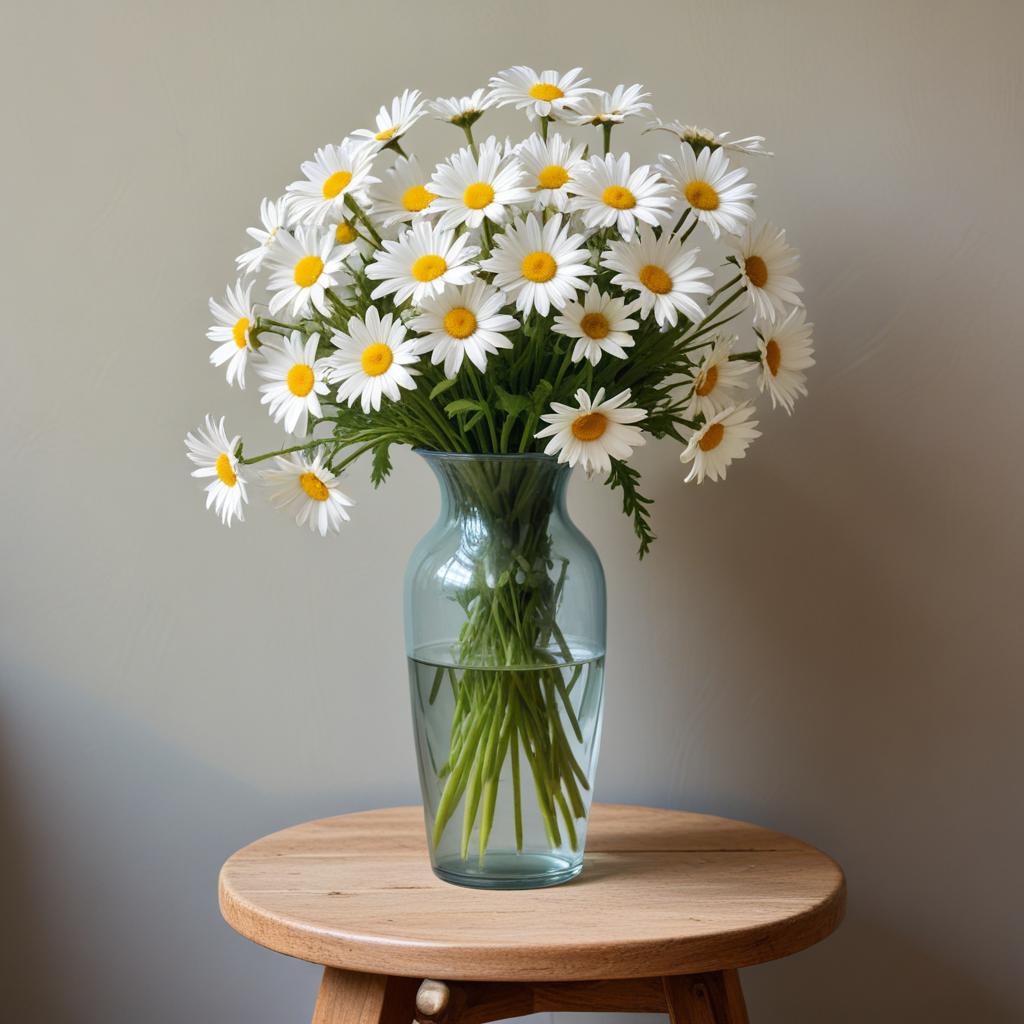 A beautiful bouquet of white daisies with yellow centers sits in a clear glass vase on a wooden stool against a plain wall.