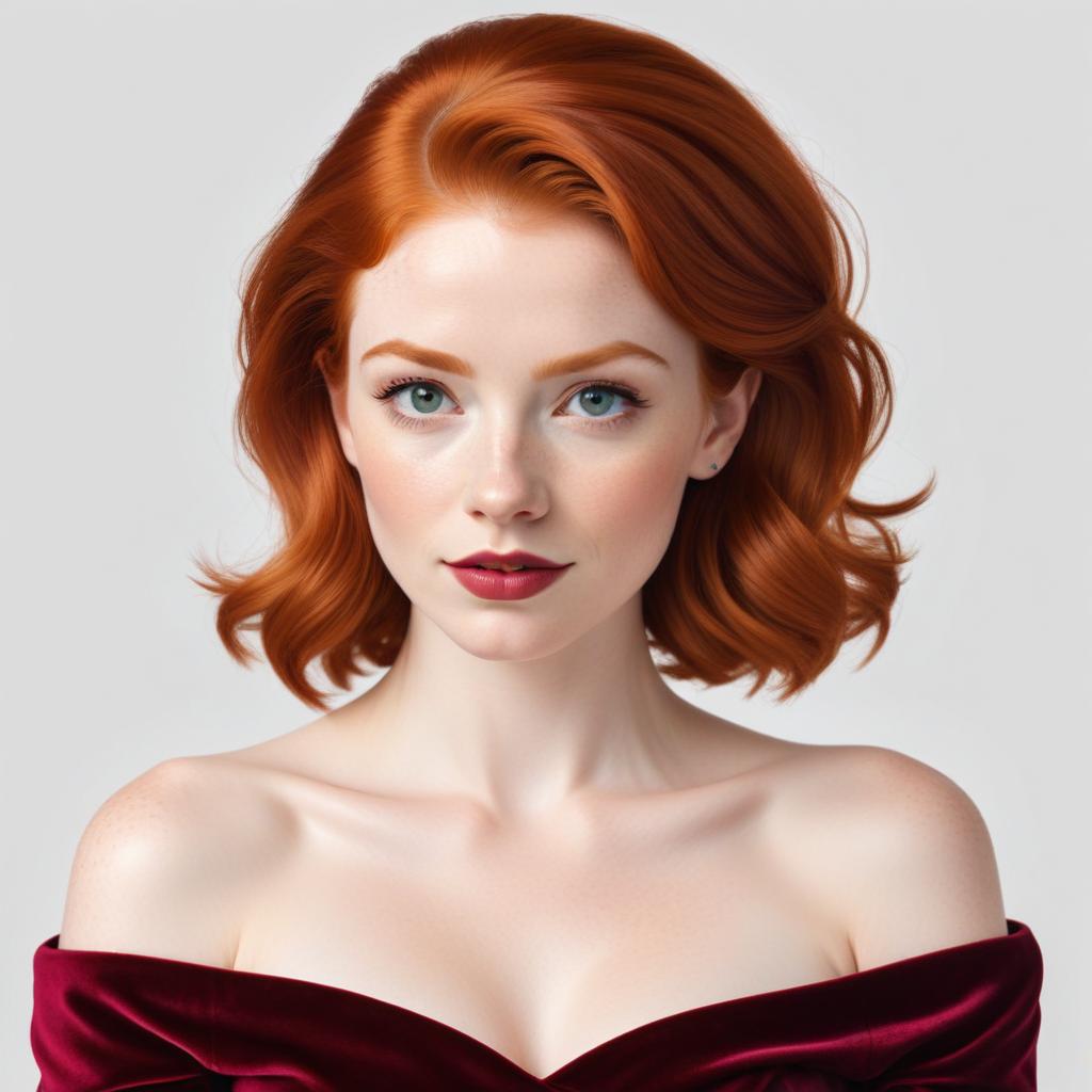 A woman with vibrant red hair poses gracefully, wearing a luxurious deep red dress that highlights her features against a soft backdrop.