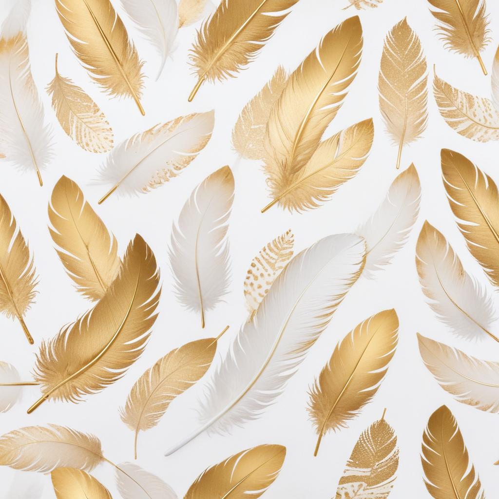 A beautiful design of gold and white feathers scattered on a light backdrop. Perfect for artistic or decorative purposes.