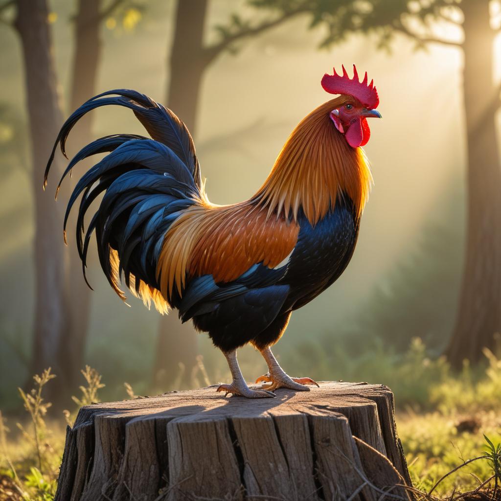 A rooster with bright feathers stands proudly on a tree stump. The sun rises behind him, creating a warm glow in the forest setting.