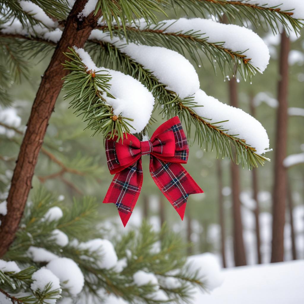 bow, branches, decoration, evergreen, festive, forest, holiday, nature, outdoor, pine, plaid, red, ribbon, scenery, seasonal, serene, snow, snowflakes, tranquil, winter