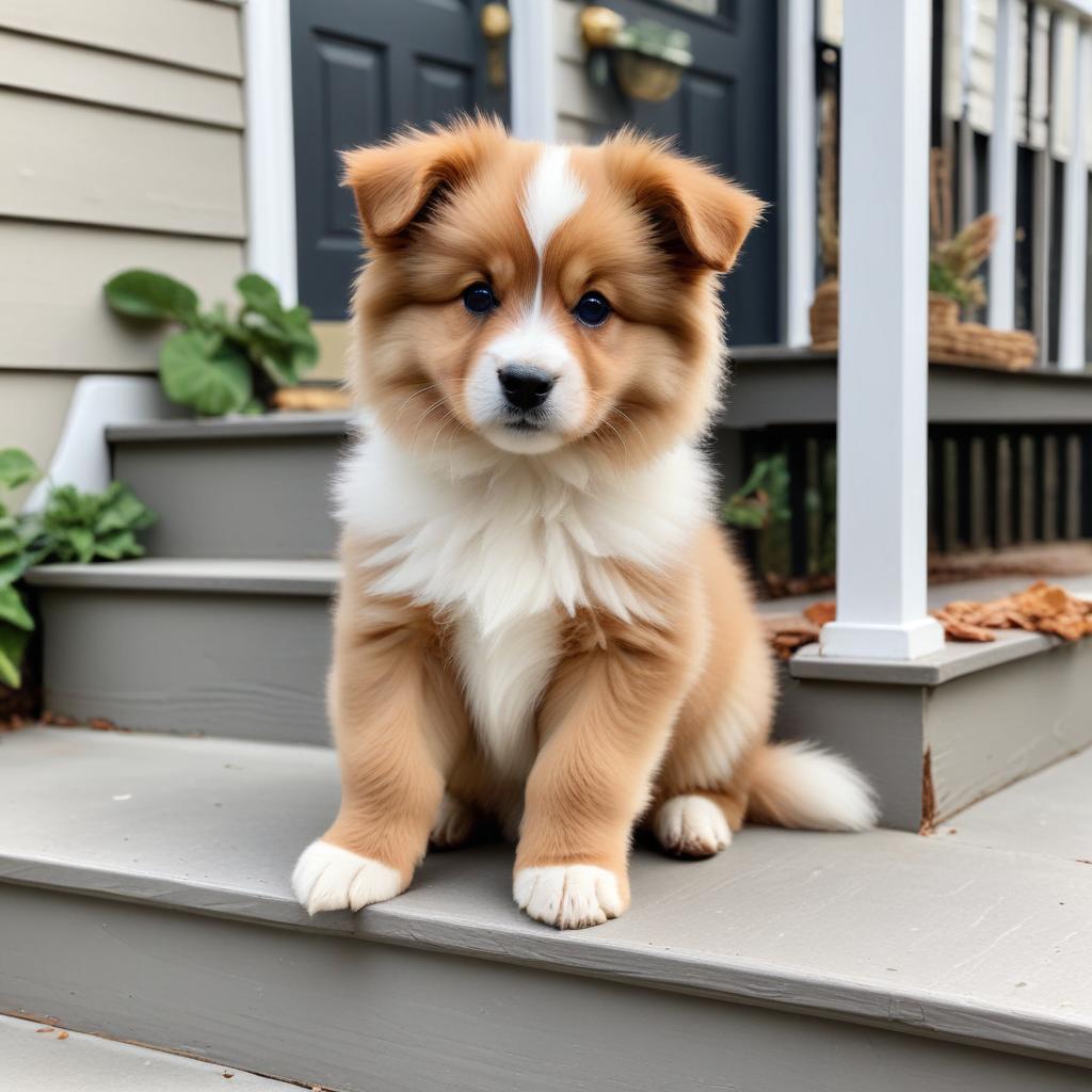 A fluffy puppy with a brown and white coat sits on the steps of a house. Green plants surround the area, creating a cozy atmosphere.