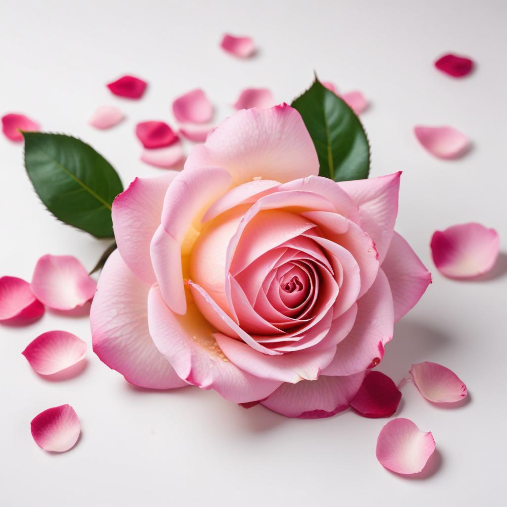 A delicate pink rose is centered on a light surface, surrounded by scattered rose petals in shades of pink, creating a romantic scene.