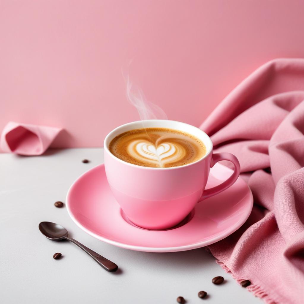 A steaming cup of coffee sits on a pink saucer. The creamy surface features an intricate latte art design, surrounded by pink fabric and coffee beans.