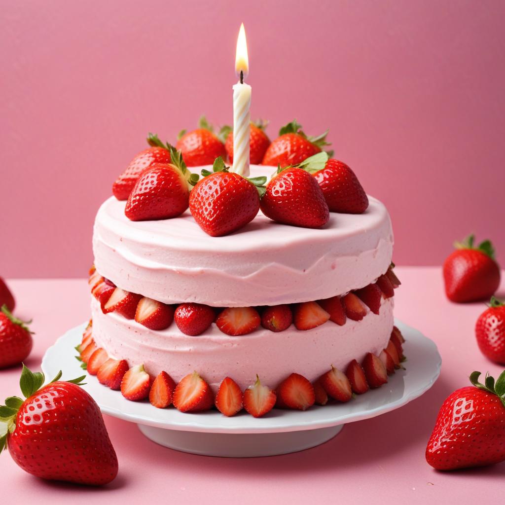 A beautiful pink strawberry cake sits on a white plate, decorated with fresh strawberries and a single candle on top.