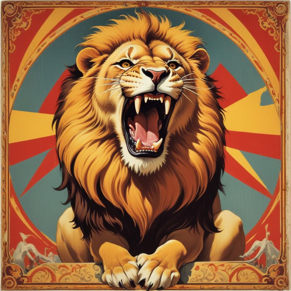 A majestic lion roars, displaying its fierce expression. The artwork features bold colors and a retro style, creating a striking visual impact.