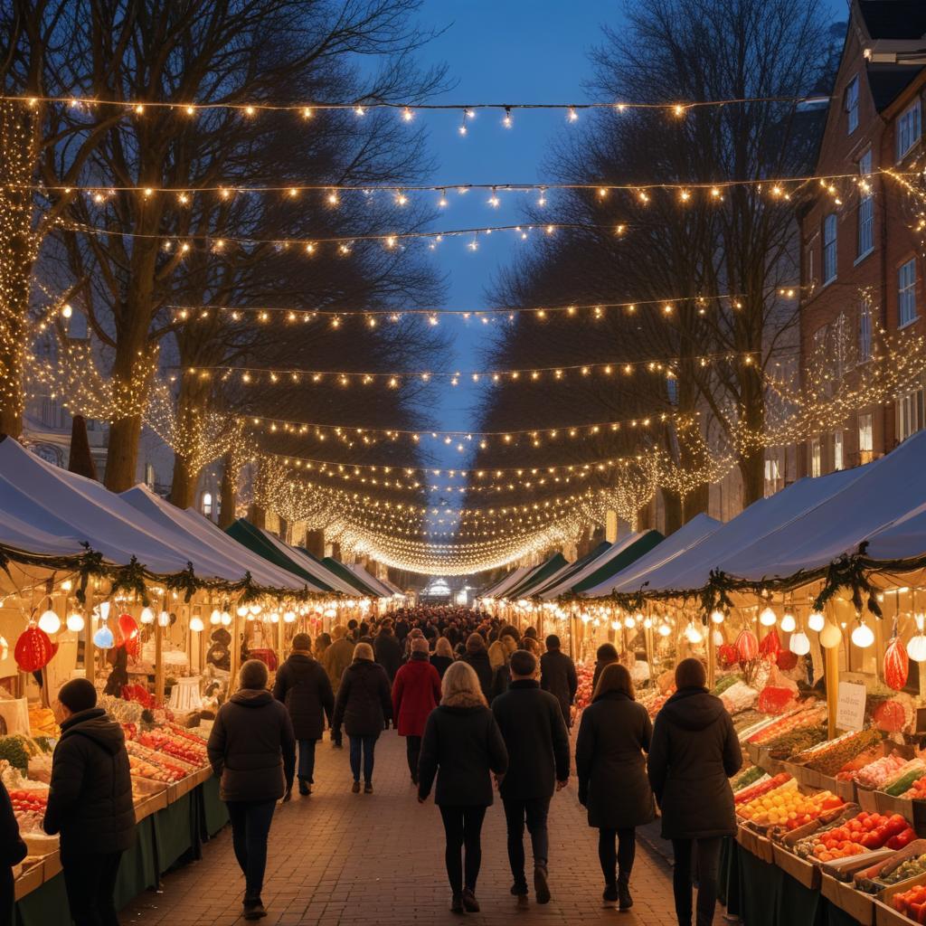 Crowds stroll through a beautifully lit market, enjoying stalls filled with fresh produce and holiday decorations on a cool evening.