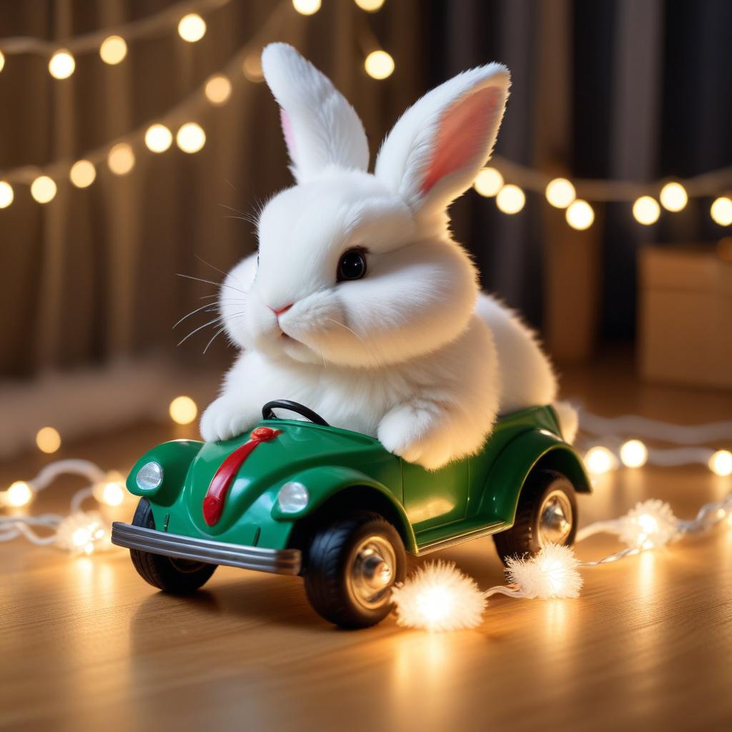 A fluffy white bunny sits in a small green toy car, surrounded by soft glowing lights. The scene looks playful and cozy, perfect for a fun moment.