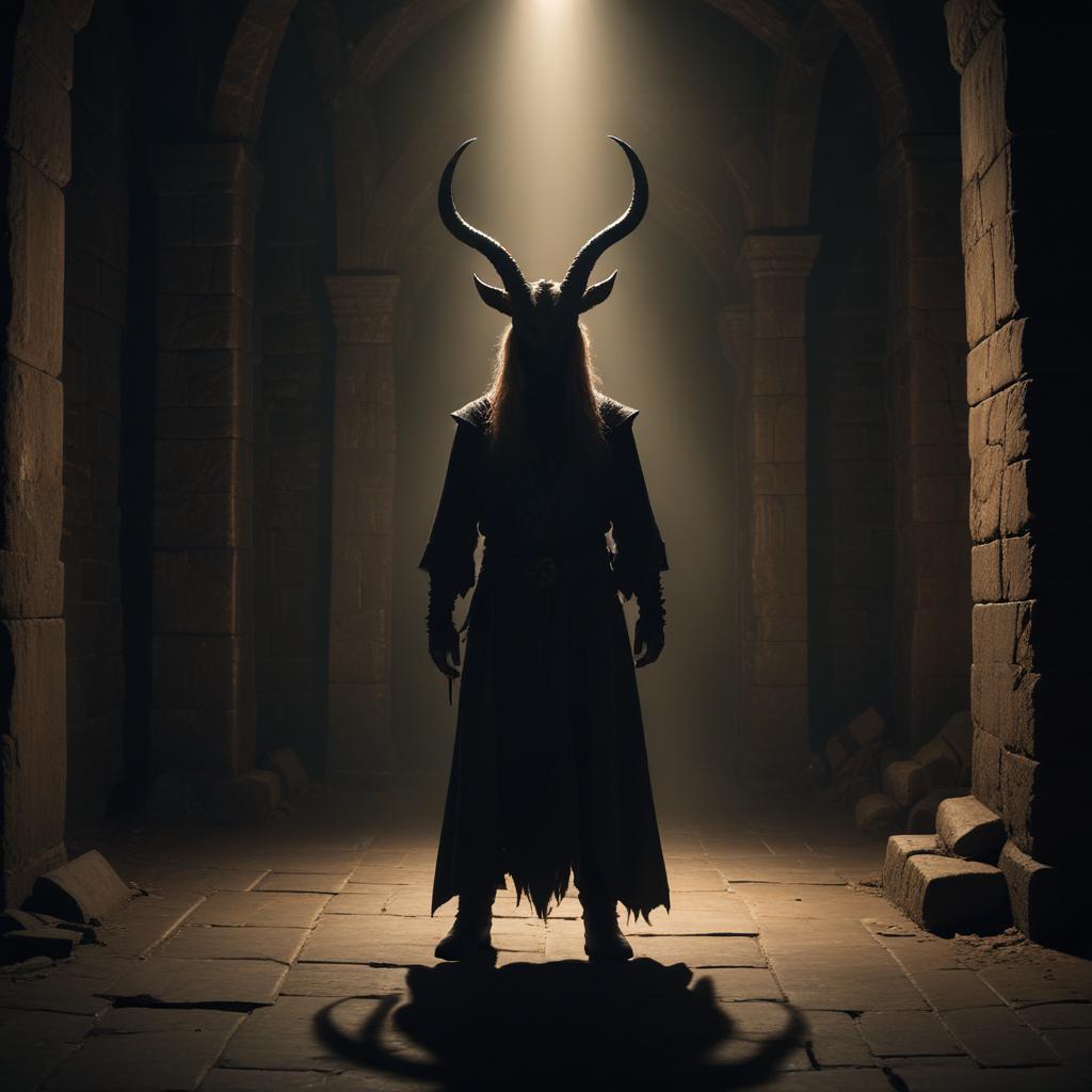 adventure, ancient stones, cinematic, cultural icon, dark setting, dim light, dramatic lighting, eerie atmosphere, fantasy, figure standing, folklore, horned character, horned figure, legend, mysterious, mystical, mythology, shadows, silhouette, stone chamber