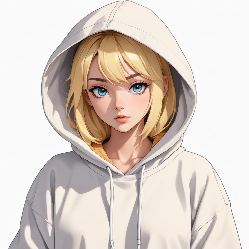 blonde, blue eyes, calm, casual wear, character design, close-up, contemporary, digital art, direct gaze, expression, fashion, hoodie, neutral background, portrait, simplicity, streetwear, style, woman, young adult, youth