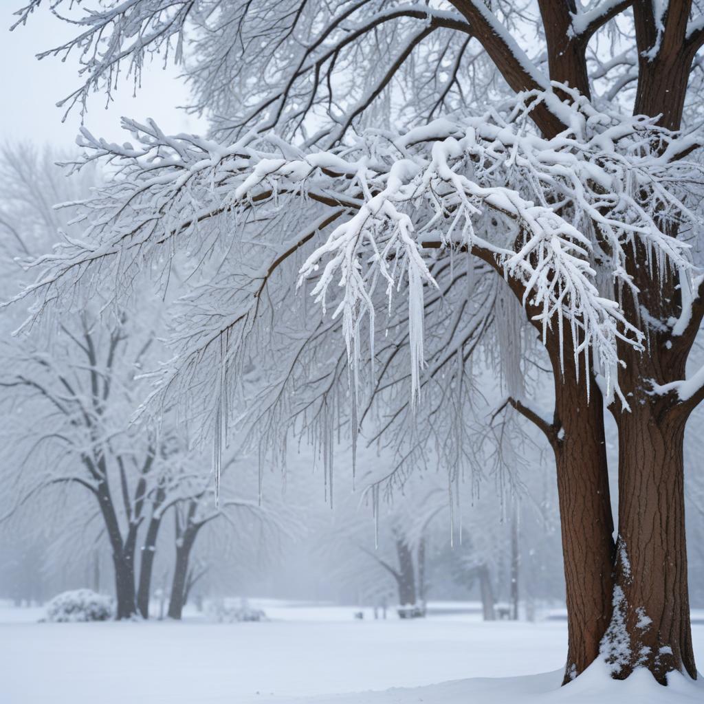 Snow-covered trees stand tall in a winter scene, with icicles hanging from branches on a foggy day in a quiet park.