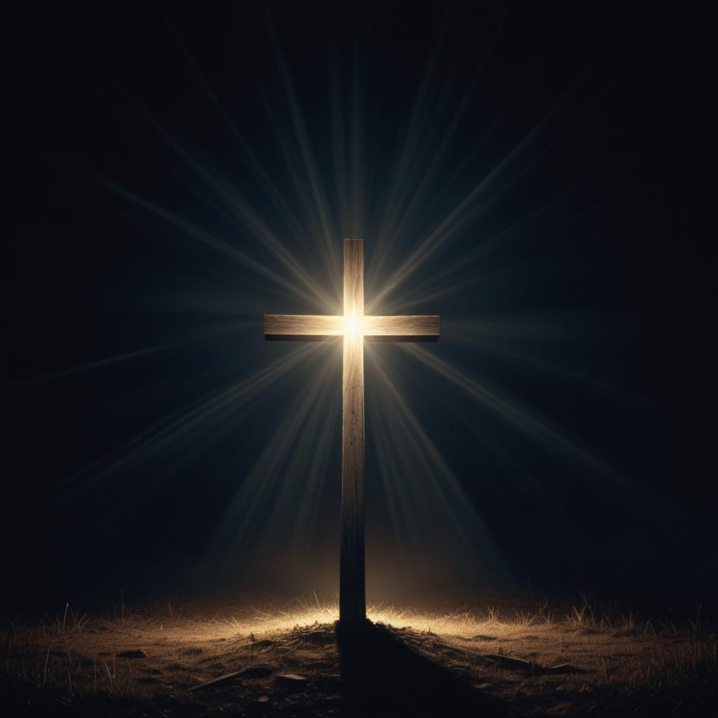 Wooden cross stands in darkness, illuminated by a bright light, creating a serene and spiritual atmosphere in the night.