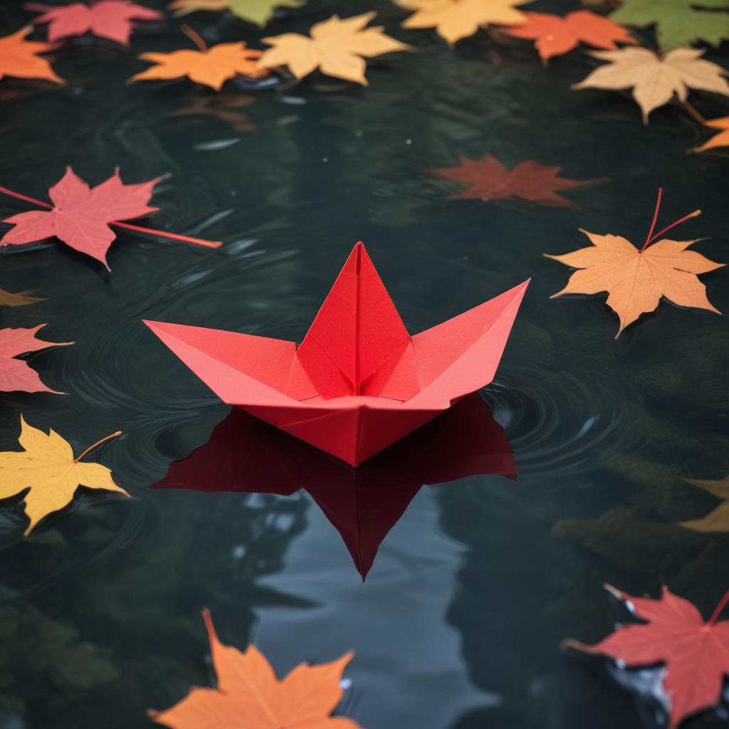 A red paper boat floats on calm water surrounded by colorful autumn leaves. The scene captures the tranquility of a fall day.