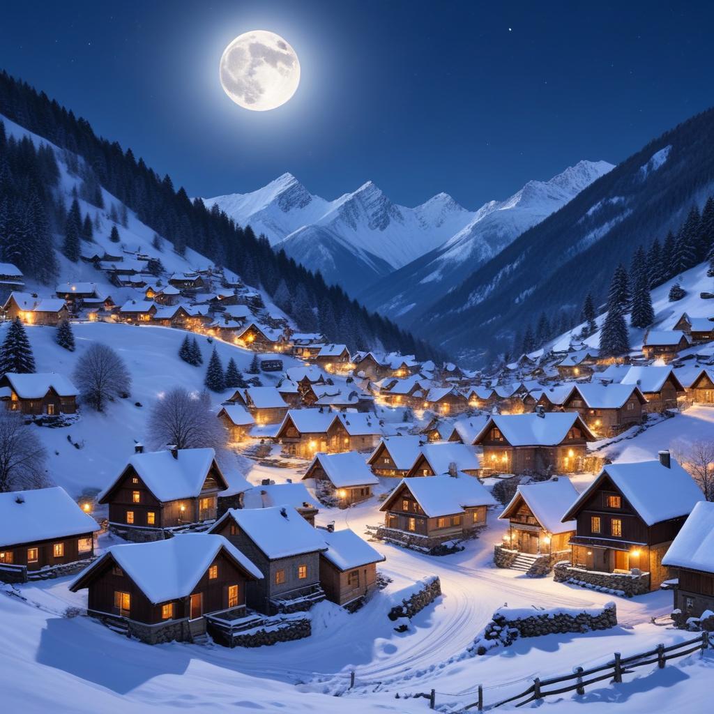 A peaceful village nestled in the mountains glows softly under the bright moon. Snow-covered rooftops create a serene winter scene.